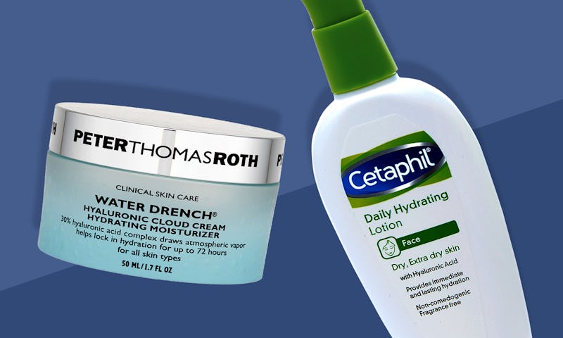 Hyaluronic acid is one of the buzziest skin care ingredients around, and for good reason: "[It's] a natural sugar molecule that attracts up to 1000 [times] its weight in water, making it a great humectant, meaning it attracts moisture," dermatologist Dr. Marisa Garshick explains to Bustle. Because of its moisture-attracting abilities, it can help promote plumper, more refreshed-looking skin, and it's great for treating dehydrated skin as well. One of the easiest ways to incorporate hyaluronic acid into your routine is via a cream or lotion, and you'll find four of the best hyaluronic acid moisturizers listed ahead. But as Dr. Garshick says, "It is important to remember that because [hyaluronic acid] is a large molecule, it can be difficult to penetrate the skin barrier, so it is important to understand the formulation you are using to determine what the specific benefits will be." Usually, the best hyaluronic acid products contain multiple molecular weights of the substance, because each size can penetrate a different dermal layer. So, the more variation in terms of molecular size, the more layers of skin that will benefit.